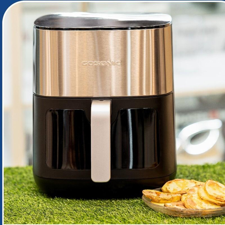 سرخ کن هواپز گاسونیک مدل ۷۵۷ ظرفیت ۶.۵ لیتر توان ۲۰۰۰ وات تنها سرخکن دارای ۲ المنت بالا و پایین صفحه کلید و نمایشگر دیجیتال و لمسی دارای ۱۰ منوی پیش فرض طبخ غذا با قابلیت تغییر دما و زمان بصورت دستی مناسب جهت طبخ انواع استیک ، غذاهای دریایی ، فست فود ، کاپ کیک و.... قابلیت مشاهدهی داخل دستگاه در هنگام پخت
