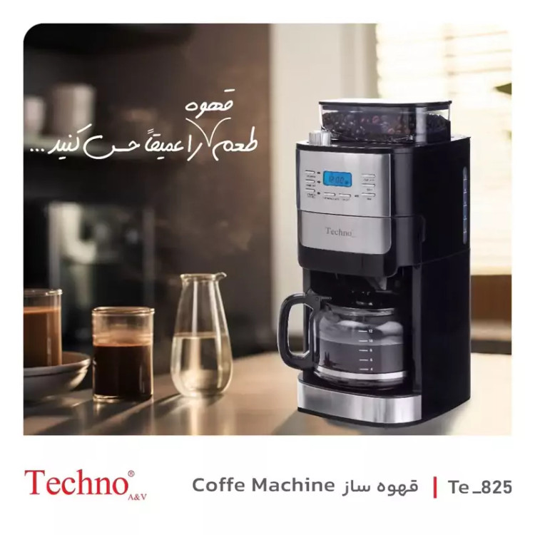 قهوه ساز تکنو مدل TE-825 . توان دستگاه 1000 وات . قهوه ساز فرانسه دارای آسیاب قهوه . دارای نمایشگر دیجیتال . قابلیت تنظیم میزان آسیاب (ریز و درشت) . دارای سینی گرم نگهدارندهٔ قوری . دارای فیلتر قابل شستشو . قابلیت تهیه تا 12 فنجان قهوه . دارای تایمر . گارانتی کتبی و 24 ماهه + دفترچه راهنمای فارسی