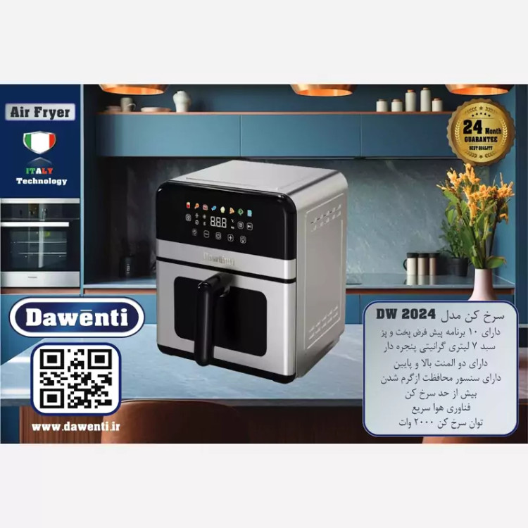 سرخ کن هواپز داونتی مدل DW2024 دارای 2 المنت بالا و پایین توان 2000 وات سبد گرانیتی با ظرفیت 7 لیتر دارای 10 برنامهی پخت و پز پیش فرض قابلیت روئیت تمام مراحل پخت از طریق پنجره با چراغ روشنایی داخلی دارای سنسور محافظت از گرم شدن بیش از حد سرخکن پخت یکنواخت و 360 درجه دفترچه راهنمای فارسی و ضمانتنامهی کتبی 24 ماهه