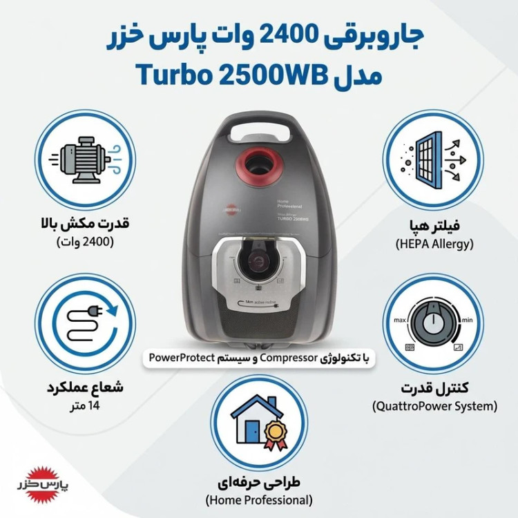 جاروبرقی پارس خزر مدل «Turbo 2500WB» یکی از محصولات باکیفیت و کاربردی شرکت پارس خزر است. این دستگاه از نوع جاروبرقیهای کیسهدار است و با برخورداری از موتور قدرتمند 2500 وات، مکش فوقالعادهی دارد که میتواند کوچکترین قسمتهای خرده شده را هم از زمین جمع کند و بهآسانی سطوح مختلف را جارو کند. سریهای متنوع این جاروبرقی باعث شده است تا کارایی جارو افزایش پیدا کند و شما بتوانید از آن برای تمیز کردن و جمعآوری خاک به هرجایی از خانه دسترسی داشته باشید. از ویژگیهای جاروبرقی پارس خزر مدل «Turbo 2500WB» میتوان به بهرهمندی از فناوری «Quattro Power» ، فیلتر ضد آلرژی«HEPA»، کیسه قابل شستشو با گیره پلاستیکی و مجهز به اسفنج در دهانه ورودی پاکت، لوله خرطومی با روکش کنفی، قابلیت« Double Filtration» و نشانگر الکترونیکی جهت نمایش پر شدن کیسه آشغال اشاره کرد.سیستم ایمنی این جارو با از داغ شدن بیشازحد و آسیب دیدن موتور دستگاه جلوگیری میکند.